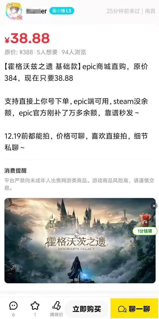至于这事有多出圈,不妨看看号称什么都能搜到的闲鱼。在Epic宣告白给后,一些有心之人在平台上挂出链接,号称只要30块就能把《霍格沃兹之遗》加入你的库存——事实上只是登入卖家Epic账号领个游戏。