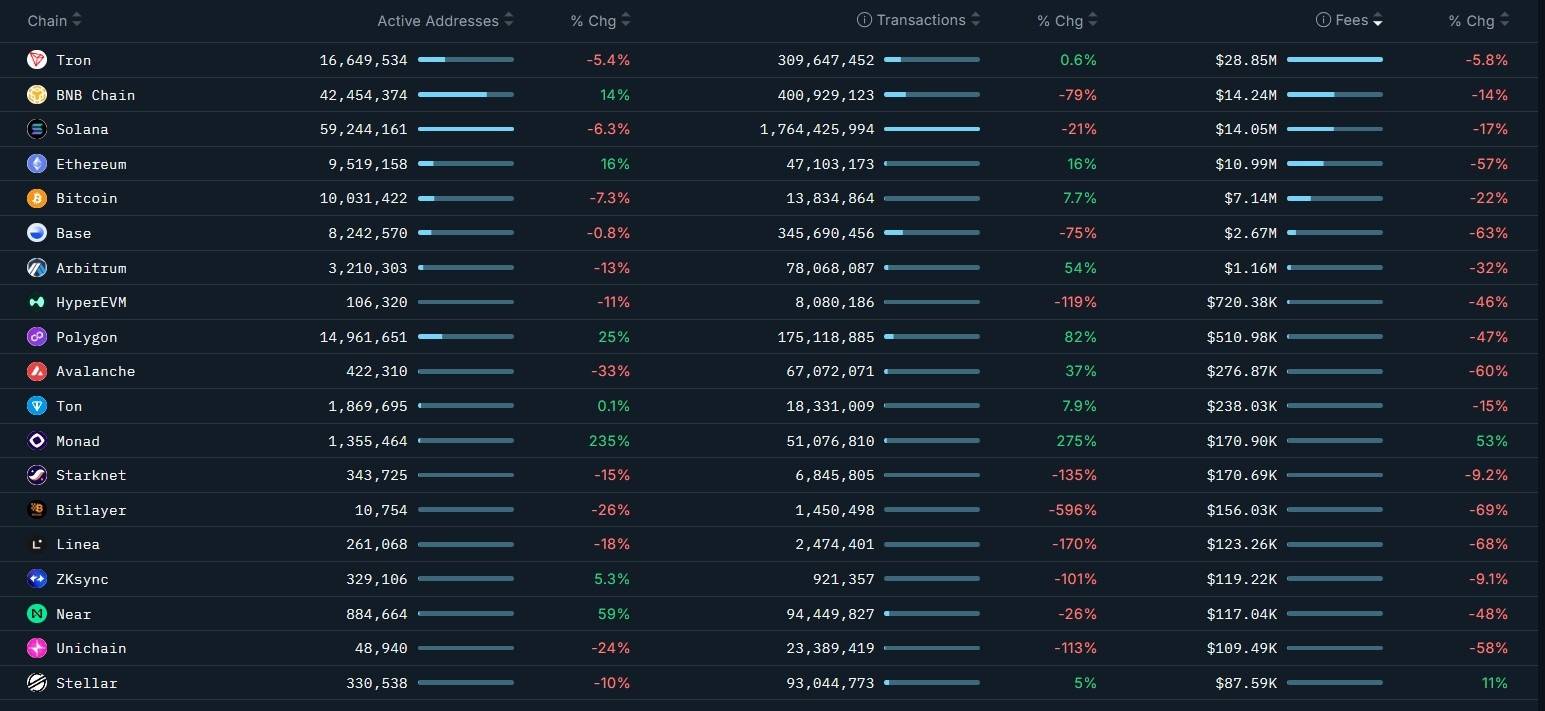 Nansen的数据显示,比特币、波场(Tron)、以太坊、Arbitrum、Polygon、Avalanche和开放网络(TON)均记录了环比交易量增长,而同期手续费收入却大幅下降。